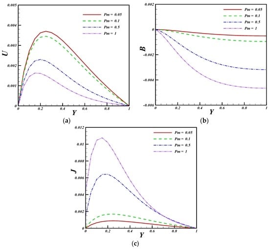 Effect of magnetic Prandtl number (Pm) on velocity (U); induced magnetic field (B) and induced current density (J) distributions when .