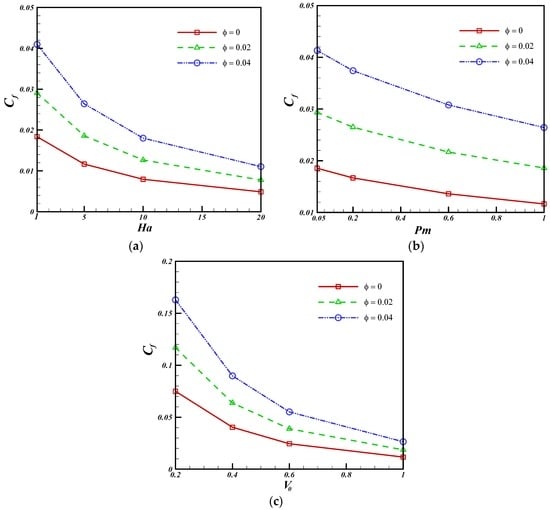 Influences of magnetic Prandtl number , Hartmann number , suction parameter and nanoparticle volume fraction on skin friction coefficient when . (a) ; (b) ; (c) .