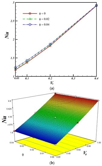 Influence of nanofluid volume fraction () and suction parameter () on Nusselt number (Nu) when .