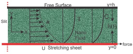 The fluid flow on a nonlinear stretching surface has attracted the attention of several investigators due to its numerous applications in the fields of engineering and industry, such as oil filtering processes, paper making processes, polymer making, food manufacturing and preserving processes, etc. The flow provides more effective results in the manufacturing of good quality products in the engineering field when heat is transferred to it, for instance via metallurgical processes, wire and fiber coating, heat exchange equipment, the polymers extrusion process, the chemical polymer process, good quality glass manufacturing and crystal growing, and so on. In case of a slow cooling rate and stretching rate of electrically conducted fluids, magneto hydrodynamic (MHD) flow provides the best quality products [1]. Sakiadis [2] was the pioneer to study the flow on a linearly stretched surface when the fluid was at rest. Crane [3] examined the flow on the stretching sheet and obtained a similar solution to the problem. He also obtained a closed form exponential solution to the linear flow on the stretching sheet. The suction and blowing process together with heat and mass transmission rate over the stretched sheet were formulated by Gupta and Gupta [4]. Elbashbeshy [5] inspected the flow on the stretched surface with inconstant heat flux. Aziz [6] investigated the flow on an unsteady stretching sheet and observed the heat radiation effect. Mukhopadyay [7] later considered thermal radiation’s effect on a vertically stretched surface with a porous medium. Shateyi and Motsa [8] discussed heat and mass transfer rates over a horizontal stretched surface numerically. Aziz [9] investigated momentum and the heat effect on an electric current providing and incompressible fluid over a linear stretching surface. Hady et al. [10] extended the abovementioned work and discussed heat transfer and radiation effect on viscous flow of a nanofluid over a non-linearly stretched surface. Pavlov [11] examined the MHD flow of a viscous fluid with constant density over a linear stretched surface. Bianco et al. [12] investigated the second principle of thermodynamics applied to a water–Al2O3 nanofluid. They studied that how the generation of entropy within the tube varies if inlet conditions, particle concentrations, and dimensions are changed. Nadeem et al. [13,14,15,16] investigated a variety of fluid models on the stretching surface by taking linear as well as exponential sheets. Such flow nowadays has many applications in the fields of physics, chemistry, and engineering; processes such as the cooling of an electro-magnetic fluid on a stretching sheet can be used to make a good quality thinning copper wire. Suction and blowing processes, and heat and mass transferring with time-dependent surface, were analyzed by Elbashbeshy and Bazid [17].