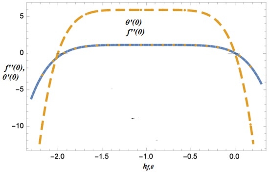 The combined graph of -curves f”(0) θ’(0), Pr = 10, Br = 0.8, Nr = 0.8, Du = 0.8, Sc = 0.4, ε = 0.8, Sr = 0.4, λ = 0.8, Λ = 1, β = 1, S = 0.3.
