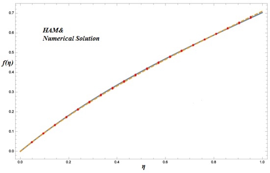 The comparison between HAM and numerical solutions for velocity profile , when = −0.28, Pr = 10, Br = 0.1, Nr = 0.1, Du = 0.1, Sc = 0.1, ε = 0.1, Sr = 0.1, λ = 0.1, Λ = 0.1, β = 1, S = 0.1.