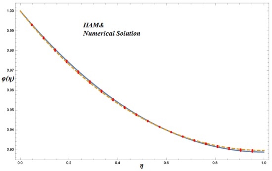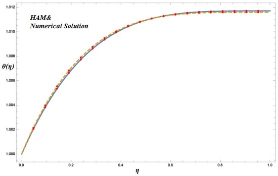 The comparison between HAM and numerical solutions for temperature fields , when = −0.45, Pr = 10, Br = 0.7, Nr = 0.3, Du = 0.3, Sc = 0.9, ε = 0.9, Sr = 0.1, λ = 0.1, Λ = 0.1, β = 1, S = 0.2.