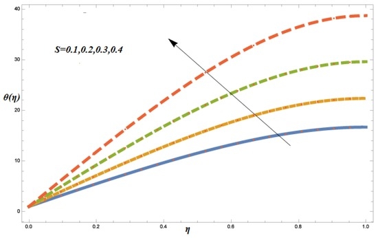 The variation of temperature scale gradient for different quantities of S, when = −0.25, Pr = 10, Br = 0.7, Nr = 0.7, Du = 0.7, Sc = 0.7, ε = 0.7, Sr = 0.7, λ = 0.7, Λ = 0.7, β = 1.