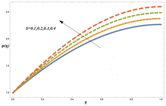 Variations in concentration field occur for different numbers of S, when = −0.25, Pr = 10, Br = 0.7, Nr = 0.7, Du = 0.7, Sc = 0.7, ε = 0.7, Sr = 0.7, λ = 0.7, Λ = 0.7, β = 1.