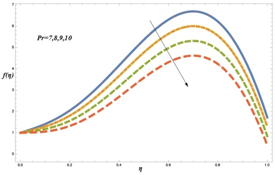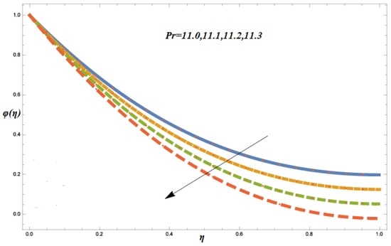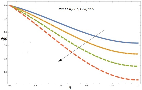 The variation of temperature scale gradient for different values of Pr, when = −0.25, S = 0.7, Br = 0.7, Nr = 0.7, Du = 0.7, Sc = 0.7, ε = 0.7, Sr = 0.7, λ = 0.7, Λ = 0.7, β = 1.