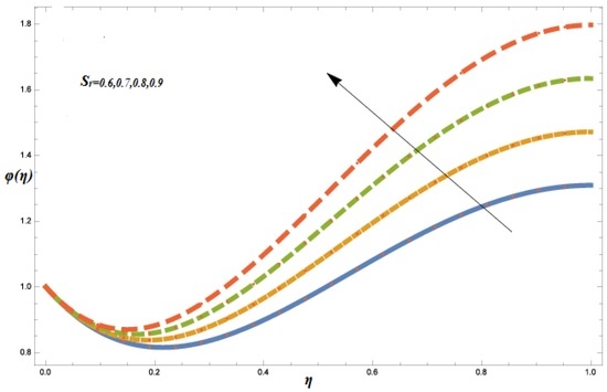 Variations in concentration field occur for different values of Sr, when = −0.25, S = 0.7, Br = 0.7, Nr = 0.7, Pr = 10, Sc = 0.7, ε = 0.7, Du = 0.7, λ = 0.7, Λ = 0.7, β = 1.