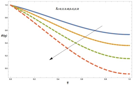 The variation of temperature scale gradient for different values of Sc, when = −0.25, S = 0.7, Br = 0.7, Nr = 0.7, Pr = 10, Du = 0.7, ε = 0.7, Sr = 0.7, λ = 0.7, Λ = 0.7, β = 1.