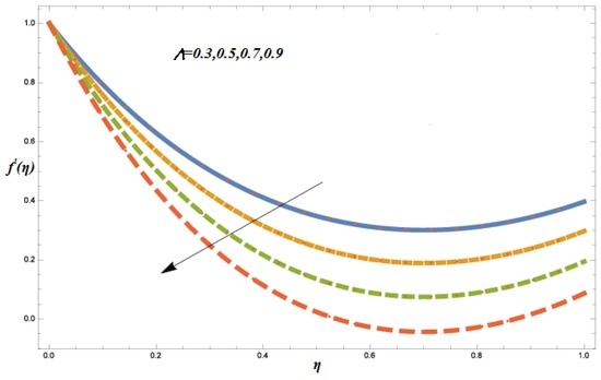 Variations in velocity field for various values of , when = −0.25, Pr = 10, Sc = 0.7, Λ = 0.7, Du = 0.7, β = 1, S = 0.7.