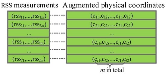 In the target environment, we denote the sets of l calibrated locations, as well as corresponding RSS measurements as and , where is the two-dimensional physical coordinate of the i-th calibrated location. is the RSS measurement collected at , where is the RSS value from the k-th AP at the i-th calibrated location and m is the number of Access Points (AP). To guarantee that the physical coordinates and RSS measurements have the same dimension, we simply replicate the physical coordinate of each calibrated location times (when m is odd, the replication will do times, which is ended by adding the former element of the two-dimensional physical coordinate, such that ) to obtain the set of l augmented physical coordinates . To be clearer, the result of location calibration is shown in Figure 1.