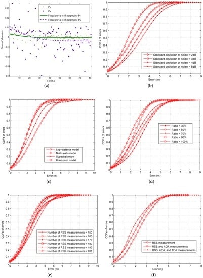 Finally, based on the same layout in Figure 2, we give a simple example about the localization performance by using the single RSS measurement, double RSS and AOA measurements and triple RSS, AOA and TOA measurements for localization, respectively, in Figure 3f. In the testing, the standard deviations of AOA and TOA measurements are assumed to be evenly distributed in the ranges of [0.5, 5] and [0.3 ns, 6 ns], respectively, which are also used in [39]. From this figure, we can find that more types of measurements used for localization generally result in a higher localization accuracy, which triggers the motivation of generalizing the proposed approach to the scenario with multiple types of measurements used for localization.