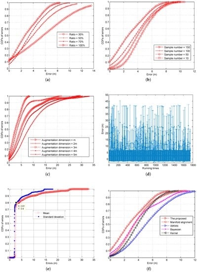 Figure 4f compares the CDFs of errors of the target by using the proposed and other four popular approaches, i.e., WKNN, Bayesian, kernel and the conventional manifold alignment without transformation matrices [28]. From this figure, we can find that the proposed approach outperforms the other four in localization accuracy, which demonstrates the significant benefit provided by the dimension expansion to the manifold alignment for indoor localization. In addition, the mean and standard deviation of errors are also illustrated in Table 2, from which we can find that both the smallest mean and standard deviation of errors, i.e., 2.4 m and 1.1 m, are achieved by the proposed approach. Furthermore, Figure 5 shows the mean of errors under different numbers of RSS samples at each RP and the ratios of calibrated fingerprints, from which we can find that the proposed approach achieves good localization performance especially under the small number of RSS samples at each RP and low ratios of calibrated fingerprints.