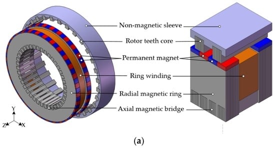 The basic single-phase unit structure is shown in Figure 1a. The stator core is comprised of two radial magnetic rings and several axial magnetic bridges. Both the radial flux ring and the axial flux bridge can be manufactured by silicon-steel sheets, and the direction of lamination is shown in Figure 1a; the armature winding is ring-shaped, and it is fixed in the coil window of stator core; the PMs are radial magnetized and fixed on the outer surface of the radial flux ring, each two adjacent PMs on the same radial flux ring have opposite magnetization direction, and each two axially corresponding PMs on two different radial flux rings also have opposite magnetization direction; the rotor is comprised of rotor teeth cores and a non-magnetic sleeve. Three-phase motor structure can be assembled by arranging three single-phase units along the axial direction with 120° electrical angle difference between each other, as shown in Figure 1b.