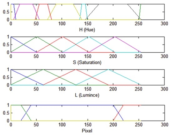 In fuzzy color space, the hue component (H) represents the color tone (red or blue), saturation (S) is the amount of color (vivid red or pale red), and lightness (L) is the amount of light (it allows us to distinguish between a dark color and a light color) [14]. Fuzzy color space transforms the environmental background color and calculates the average distribution of hue, saturation, and lightness (Figure 5). It isolates an object from the background environment, and obtains the image of the object as an intruder.