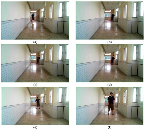 Steps for mean shift tracking process against a static background: (a) Find the object; (b) the object moves to the right side; (c) search high color density; (d) catch the object; (e) the object moves forward; (f) keep tracking the object.