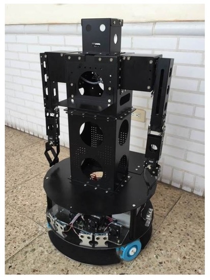 The proposed control scheme is performed through experiment verification by an omnidirectional WMR, as shown in Figure 9. The omnidirectional WMR’s chassis size is 240 mm radius. Three omni wheels are configured in space 120° and three 12V-DC motors are installed to provide rated torque of 68 mNm. The robot is 600 mm in length, 400 mm in width, and 850 mm high. It has mechanical arms and fingers that are able to grip things; their length is 470 mm and 150 mm, respectively. The robot arms have six MX-64 motors, two in the shoulder and one in the elbow on both sides. MX-64 is 40.2 mm in length, 41 mm in width, and 61.1 mm high. Its stall torque is 6.0 mNm. There are two MX-28 motors at the wrist on both sides. MX-28 is 35.6 mm in length, 35.5 mm in width, and 50.6 mm high. Its stall torque is 2.5 mNm. The motors are shown in Figure 10.