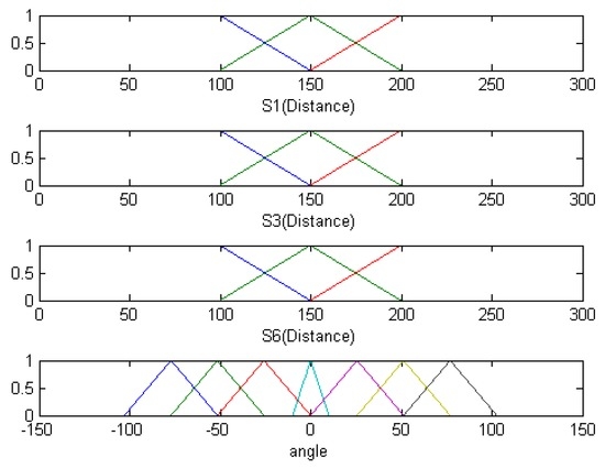 There are six ultrasonic sensors installed in front of the second layer of the chassis and they are PARALLAX PING ultrasonic distance sensor. The detection distance is approximately 2 cm to 3 m, the burst frequency is 40 KHz, the current is 30 mA, and the voltage is 5 V, as shown in Figure 13. The sensors are used to measure the distance and detect and avoid obstacles. Fuzzy theory is applied to obstacle avoidance control. The fuzzy control structure has four inputs and one output. Ultrasonic signals S1, S3, and S6 are inputs and the value is distance. Fuzzy sets are F (far), M (medium), and N (near). Output DA is the angle for left or right; fuzzy sets are VL, L, S, R, and VR. Fuzzy rules are shown as follows, and the fuzzy sets are shown in Figure 14.