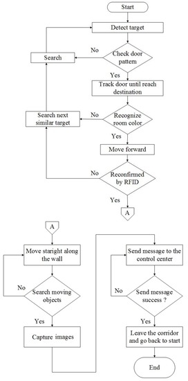 A flowchart of the control sequence is shown in Figure 15. First, the robot will search for the predefined door in the experimental environment. When the robot detects the specified color target, it moves forward. On the way to this objective, the robot will correct its path by detecting the image range at all times. When the robot reaches the specified distance from the door, it will correct its angle to aim at the door. Then it recognizes the room color and checks whether it has reached the destination or not. If the room color represents the desired destination, the robot moves to the door and RFID, as shown in Figure 16, reconfirms at the specified distance to verify the target. If the room is not the destination, the robot will search for the next similar target. The RFID will verify the destination again and make sure it is true. When the robot is 500 mm away from the door, the robot will turn to patrol the corridor. When an object appears in the corridor and is intercepted, an image of the object will be transmitted to the control center via Wi-Fi. Staff in the control center can check the object; if it is an intruder they will send a security guard to the scene to ensure safety. If the object is not an intruder, the robot will return to the starting position along the planned route.