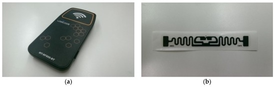 (a) Ultra High Frequency (UHF) RFID reader MT-RF800-BT and (b) UHF tag.