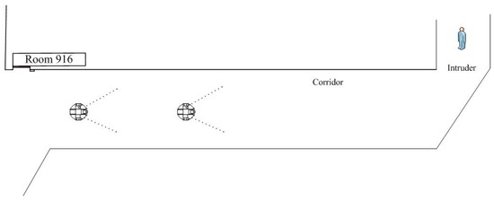 A team with two robots is presented in this subsection. These two robots use the same path planning and tracking control scheme. When the first robot finds the intruder, the robot will send a warning message to the control center in the remote site and to the second robot. The second robot acts as a backup security guard. Figure 17 shows the initial setup and experimental environment with the starting location and destination room given. In Figure 18, the target door is not detected at the initial position, so the robot will turn left to face the door. When DL section detects the target, the robot turns left and moves forward. If the DR section detects the target, the robot turns right. When the DM section detects the target, the robot stops turning and moves forward to the door, as shown in Figure 19.