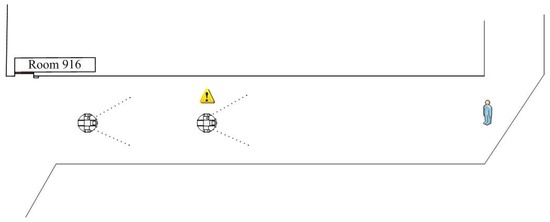 In Figure 27, twin robots patrol the corridor and check whether there is an intruder or not. At the other end of the corridor, a man walks in front of the robot. The proposed control scheme can detect environmental colors and find the intruder. When an object appears in the corridor and is intercepted, the image of the object and an alarm signal will be transmitted to the control center and to the second robot via DataSocket server connection IP address and Wi-Fi, as shown in Figure 28 and Figure 29.