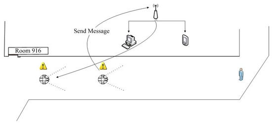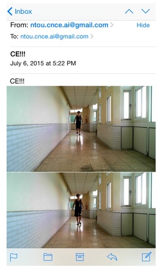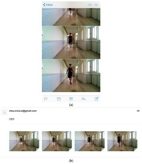 The proposed control scheme detects environmental colors and finds intruders. When an object appears in the corridor and is intercepted, an image of the object and an alarm signal will be transmitted to the remote control center and to the user’s mobile phone via Wi-Fi, as shown in Figure 32.