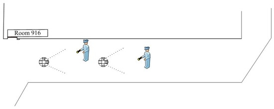 The RFID reader and tag are applied to verify the destination. When omnidirectional WMR approaches a door, the RFID reader will check the tag’s UID. Each RFID tag has its own UID code. Each UID corresponds to a certain room number. A tag posted on the door is shown in Figure 20.