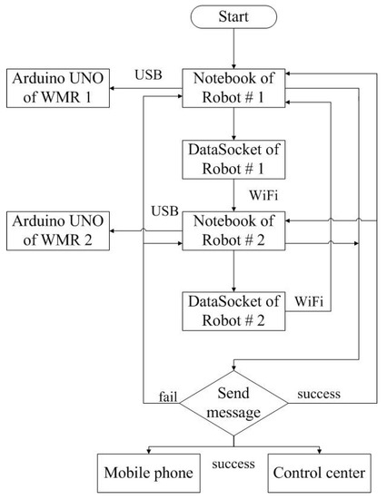 This experiment presents a twin robot indoor patrol. There are six steps in the control sequence: (1) Search for a predefined target and track a designated door; (2) Correct the direction and recognize the first room color; (3) Approach the first room and verify via RFID; (4) Move forward along the wall; (5) Detect an object; (6) Send a message to the control center. Communications of WMR, notebook, control center, and mobile phone are shown in Figure 31.