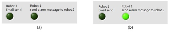 First robot sends alarm message to the second robot. (a) Robot 1 initial signal indicators are off; (b) Robot 1 sends signal to Robot 2; (c) Robot 1 sends e-mail to control center; (d) Robot 2 receives alarm message; (e) Robot 2 sends e-mail to control center.