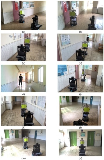 Experimental results of dual-robot patrol. (a) Starting position; (b) detecting doors; (c) moving forward to destination door; (d) when the robot approaches to the door, it will correct its position to aim at the room plate and door; (e) if it is the correct destination, the robot will approach the door and use RFID to verify the tag UID; (f) the robot turns right after verification is confirmed; (g) shifting path; (h) find moving object; (i) mean shift tracking and send message to the control center; (j) come to the end and rotate; (k) shifting path; (l) find the starting point of the elevator; (m) go straight to the elevator; (n) arrive back at the starting position.