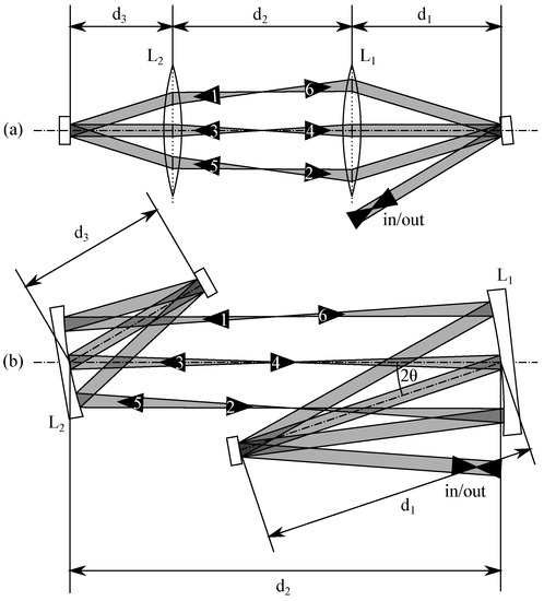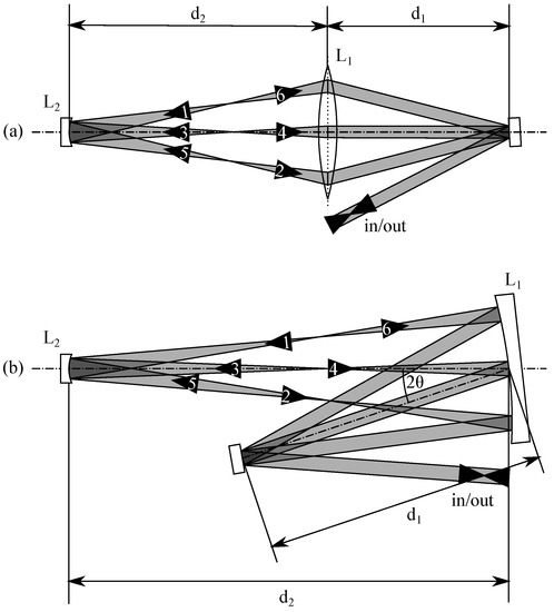 Here, to are the corresponding free space propagation distances, and and are the focal lengths of the imaging elements. This corresponds to the widely-used version of a double-passed 4f-telescope for a multiple imaging layout as, e.g., in [4,6,7]. We will refer to such a kind of system in the following as a Type I system. Schematic setups for optical systems of this type accomplishing three round-trips are exemplarily given in Figure 1.