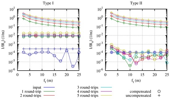 For the case of Type I systems, such a closed solution no longer exists as both and generate the astigmatism during the round-trips and are not situated in an image plane or in an equivalent one. Hence, propagation effects will also be present. The handling of this type is nevertheless identical to the procedure described in the previous section for the astigmatism due to the folding angle except for a varying incidence angle for every pass. The computations for are the same as for Type II systems except for , which is half of the value in Type I systems (cf. Figure 7):