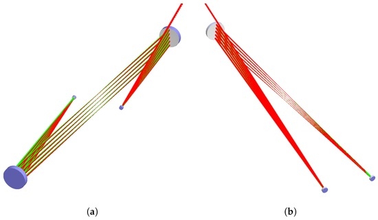 According to Section 5, the total astigmatic deformation due to the round-trips of the system is calculated to be 0.0329 in the tangential plane and −0.0328 in the sagittal plane. Now, we use the matrix method according to Section 4 to numerically find an angle that will produce the inverse amount of astigmatic deformation. Therefore, the tangential and the sagittal plane will be exchanged in relation to the round-trip-based astigmatism to achieve a compensating effect. In the tangential plane, we find an angle of θ = 3.27° and in the sagittal plane an angle of θ = 3.29°. Hence, the compensation still has a small error. As a compromise, we use θ = 3.28°. Furthermore, there is a slight error due to the distances that would have to be adapted to the modified new focal lengths. We ignore this here, since the error is small.
