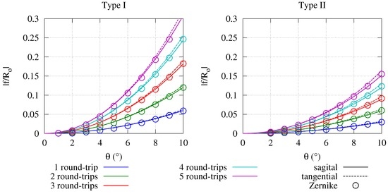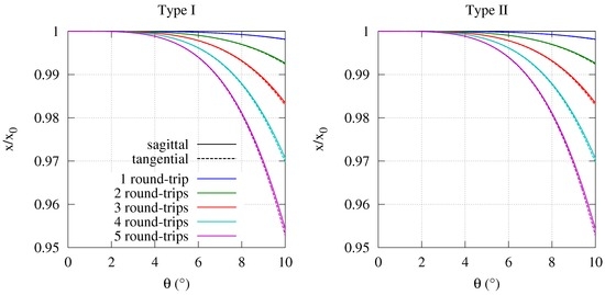 In the case of a Type II system, the sole source of astigmatism due to the round-trips is the mirror . As the mirror is placed in the radius distance to the image plane, the incidence angle on is always normal to its surface. Including the astigmatism terms for according to Equations (20) and (21) for and for a single round-trip in the tangential and sagittal plane respectively results in: