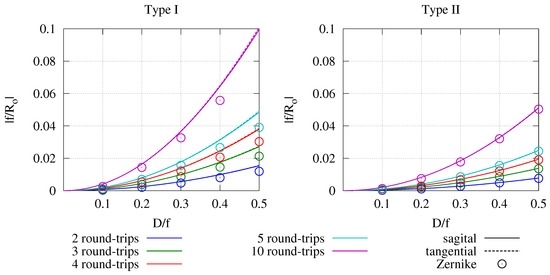 Absolute astigmatic deformation of the wavefront as a function of the ratio between the diameter D of optic and its focal width f for Type I and Type II systems. Lines are calculated by the matrix method, and single data points originate from FRED ray tracings.