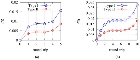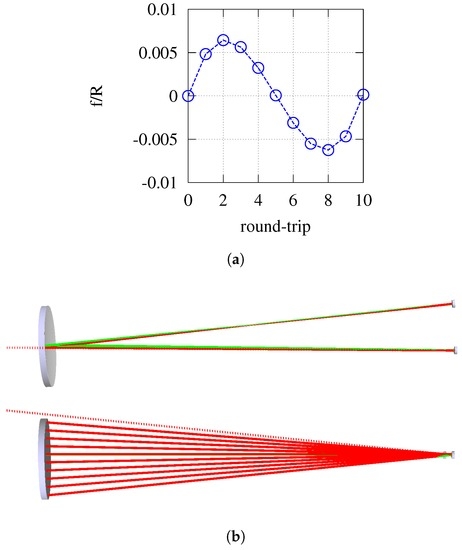 In Figure 9, the evolution of the astigmatic deformation over the round-trips is shown for sample systems with =0.3 with five and with 10 round-trips. It can be seen that due to the variation of φ over the individual passes, the main contribution to the wavefront deformation originates from the first and the last passes, while the intermediate passes add only a minor contribution. Furthermore, as there is virtually no change in the amount of deformation during the middle passes, the assumption that the chosen folding angle θ is sufficiently small to be negligible is confirmed.