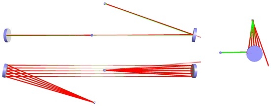 In Figure 3, the validity of the derived compensation formulas is demonstrated using the ray-tracing software FRED. The traces are performed for compensated, as well as for uncompensated systems for different values of and for up to five round-trips. The exact parameters of the test systems are displayed in Table 1. The three-dimensional layouts are shown in Figure 4. All test systems were mirror based with a folding angle = 2° to keep the influence of astigmatism negligible (cf. the next section). All traces were done with a collimated coherent Gaussian TEM00 beam with a full width at half maximum of 2 mm. The source area was 5 mm wide and situated at a 1-mm distance from the image plane, directly pointing towards it. The short distance was chosen to avoid deformation of the wavefront due to propagation effects. The beam was sampled with 255 × 255 points. The analysis surface for recording the wave fronts was placed in front of the image plane and was 10 mm wide with 201 × 201 sampling points.