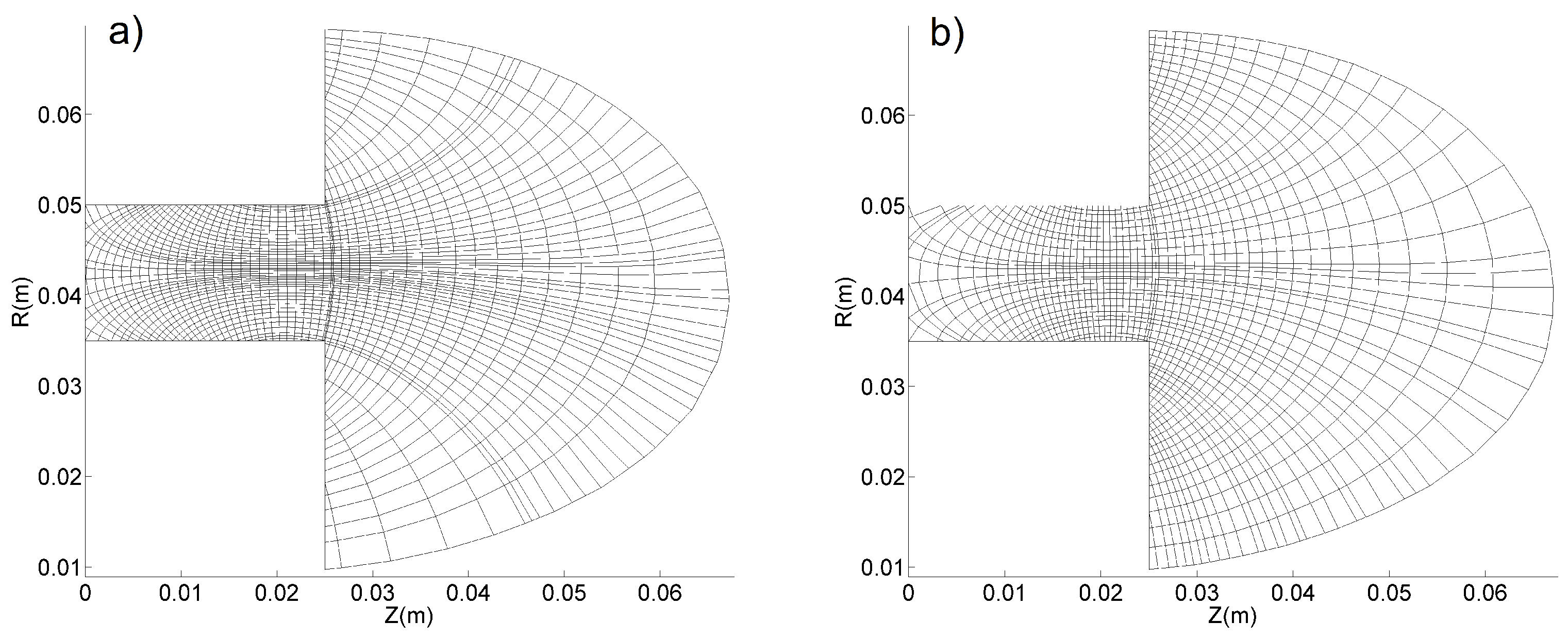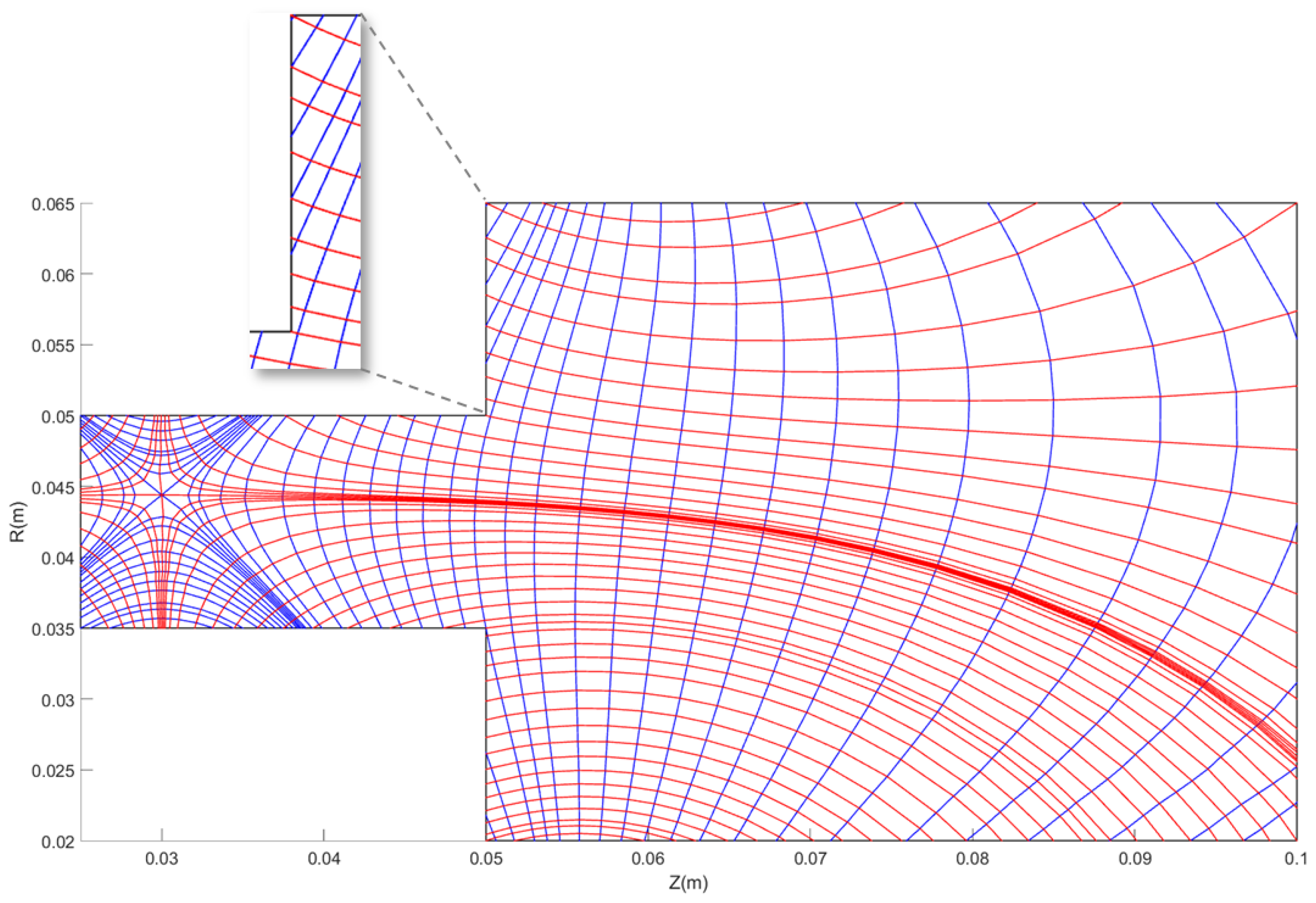 Figure 8 shows a mesh with a singular point produced using the Expanded-exponential-stretching method. This mesh is typical of some magnetic topologies of modern Hall Effect Thrusters, which try to control better the flow in the upstream region of the thruster channel.