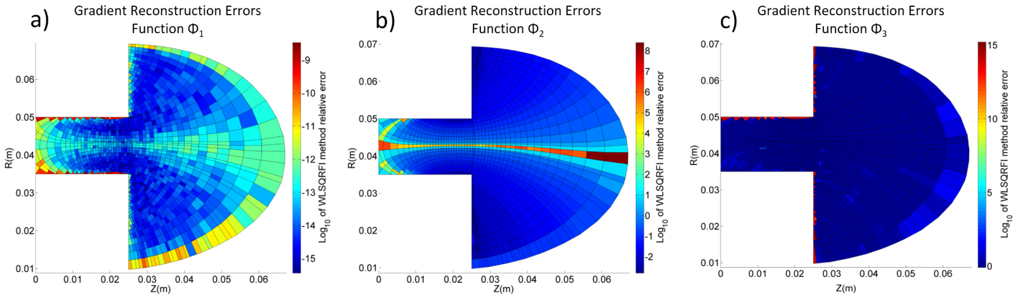 Figure 11 shows a certain correlation between low geometric quality regions and large errors in gradient reconstruction, specifically in boundary elements (poor skewness and smoothness) and poor aspect ratio elements.