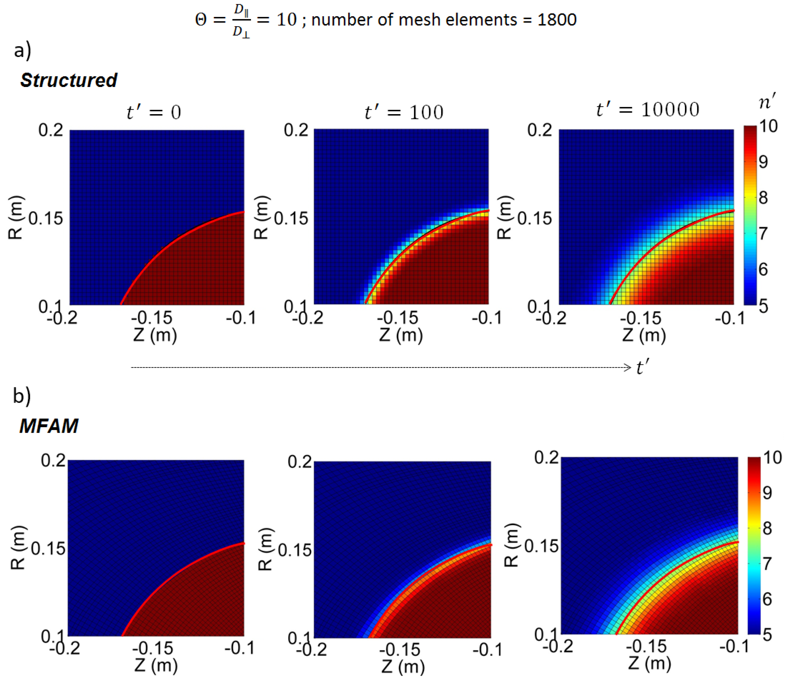 18]. Another possible mechanism to decrease the influence of this artificial numerical diffusion on the solution is the use of a mesh that is aligned with the the preferential directions of the problem; in the case of conducting fluids, those defined by the magnetic field. Indeed, in the particular case of the electron transport, because of the large anisotropicity in coefficients for the parallel and perpendicular directions, solving the governing equations in a mesh which is misaligned with respect to the magnetic field may lead to cross-contamination of the transport coefficients and thus to numerical diffusion.