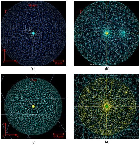 Figure 1a–d show the geometries of the problem with the meshes’ associated materials for the computational domain and the cell, respectively. The relative permittivities of materials (which describe the electromagnetic problem of Equations (1) and (2)) are given in Table 1. Here, the materials of the problem are considered to be isotropic and homogeneous.