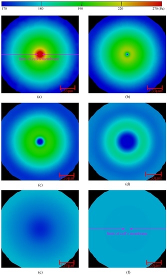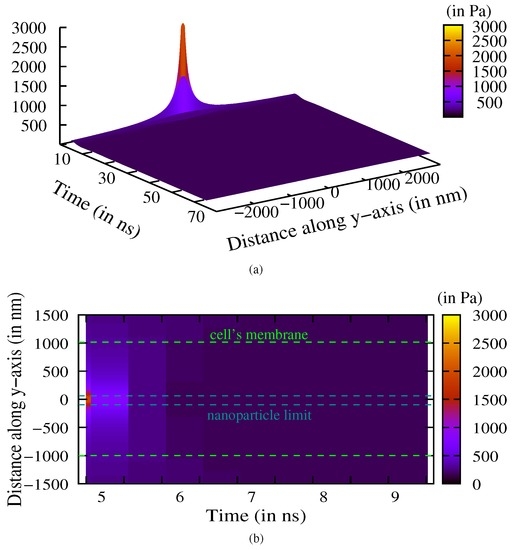 The results of the computation of the pressure maps are illustrated in Figure 2. Figure 2a–f shows the associated variations of the pressure at 0.5, 1.5, 2.5, 4.5, 14.5 and 40 ns after the illumination. The variations and the propagation of the pressure wave is shown in the hole computational domain. The numerical scheme not only takes into account the shape and size of the nanoparticle but also the variations induced by the electromagnetism, the temperature and the pressure. The pressure is initiated at the beginning of the temperature shock that is induced by the modulation of the illumination. Such an acoustic pressure wave propagates in the whole media (cell and water, corresponding to a spatial extension of some micrometers the cell membrane has spatial extension from −1 m to 1 m) before vanishing. That contrasts with the temperature propagation (see Figure 3a,b) that is mainly located in the near vicinity of the gold nanoparticle (i.e., only a few nanometers from the gold nanoparticle, corresponding to the spatial expansion of the nanoparticle along the y-axis: −50 to 50 nm). Therefore, only the nearest zone around the nanoparticle sees the temperature elevation. Figure 4 illustrates that the cell’s membrane is receiving a pressure shock wave (i.e., the variation of pressure is non vanishing at the position of the cell membrane). Figure 5 shows the maximum of the pressure at the position of the cell membrane (i.e., at m) at the initiation of the temperature and pressure shock and the evolution of the pressure at the limit of the membrane. For an illumination at nm, the two curves are obtained for two nanoparticle shapes. The first one consists of a spherical gold nanoparticle of radius nm, the second one is an ellipsoidal particle of semi-axis a = 100 nm and b = 50 nm. Such a pressure variation can induce a deformation of the cell. The deformation is determined by the shear rate of the streaming flow field (computed from the strain tensor) and the cell elasticity [21,22]. Here, with the used materials, the shear stress components are: Pa, MPa with R being the radius of the cell, e being the width of the cell’s membrane and the associated shear modulus being to GPa [23]. Moreover, the maximum rate of strain is about – (i.e., [24] where is the evolution time). That leads to a maximum tension in the membrane varying in the range , where to · is the dynamic viscosity of the aqueous solution in the cell (i.e., depending on the cell composition). Such a tension is sufficient to stabilize and neglect the thermal fluctuation of the membrane area, but will only expand the actual membrane area by a fraction (with an expansion modulus of about [24]). To achieve the shear of the membrane (or at least opening of pores), a ratio of area is necessary [24]. To extend the application in cancer therapy, the illumination must use wavelengths in the biological window (800 to 1000 nm). Such an illumination of a spherical gold nanoparticle at nm is shown in Figure 5. In such a window, the imaginary part of the permittivity of the gold nanoparticle is smaller and requires us to design the particle shape or to increase the energy laser [25]. Moreover, the use of larger cell (typically a cell size is varying from 1 to 100 m) or a mix of larger nanoparticles, greater pulse energy or a higher repetition rate of ultra-short illumination shocks (which will induce an increase in the local pressure variation at the membrane boundary and therefore the maximum rate of strain) can open the way to a process inducing a local stress (shear stress) at the membrane in order to produce a disruption of the cell’s membrane. Here, we focus on the study of one nanoparticle, nevertheless, metal nanoparticles can also be taken up by cells in 1–15 nanoparticles/vesicles [26,27]. The increase of the number of nanoparticles, if aggregated, has a similar effect of increasing the size and shape of the nanoparticle. Indeed, each nanoparticle plays the role of local temperature source inducing a photoacoustic pressure wave. Therefore, multiple pressure waves can be induced at the same time and the pressure shock at the membrane can also be increased due to the aggregated nanoparticles. Such a disruption could be produced by cytolysis (or osmotic lysis) that occurs when a cell bursts due to an osmotic imbalance that has caused excess water being released into the cell.