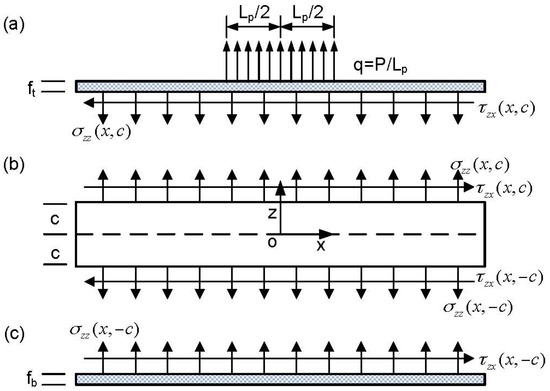 Since most engineering theories of beams, plates and shells cannot recover all stresses accurately through their constitutive equations [6,7], the modeling strategy proposed recently by present authors [12] is employed. A classical sandwich panel shown in Figure 1 is firstly divided into three parts, as shown in Figure 2. The top and bottom face sheets are modeled by Euler–Bernoulli beam theory and the core is directly modeled by two-dimensional (2D) elasticity theory without a priori assumption. After applying the continuity and equilibrium conditions at the interfaces (), the resultant differential equations of the top and bottom face sheets are used as the boundary conditions of the 2D core and then only the core needs to be analyzed. In this way, both displacement and stress in the soft-core can be accurately predicted. The Euler–Bernoulli beam assumption is usually adopted in the face sheets of sandwich panel/beam theories, e.g., the extended high-order sandwich panel theory (EHSAPT) [3], which has been validated numerically by present authors [12].