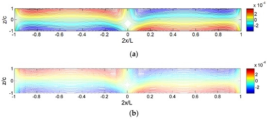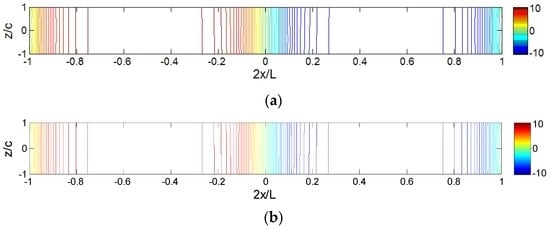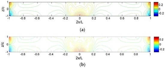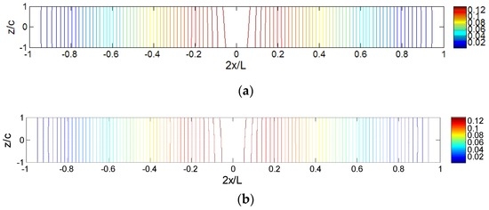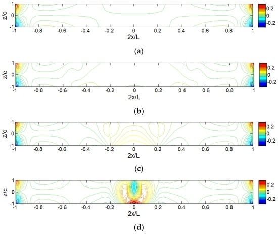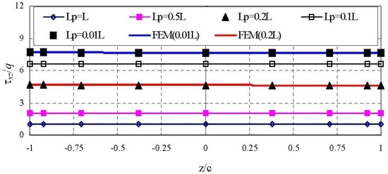 Figure 15 shows the iso-stress () diagrams for sandwich panels under different distributed loads. For the same reason, the diagram for the locally distributed load (Lp/L = 0.1) and the diagram for point load are not included in Figure 15. The loading effect on the transverse shear stress distributions, especially in the middle area, can be clearly seen. It should be pointed out that the through-thickness distribution is actually non-linear, as clearly shown in Figure 11 and Figure 12. Similar to the axial normal stress, the size of loading area, Lp/L, does not affect the maximum value of the normalized shear stress too much.