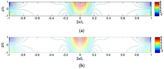 Figure 13 shows the iso-stress () diagrams for sandwich panels under different distributed loads. Since the diagram for the locally distributed load (Lp/L = 0.1) is already shown in Figure 5 and the diagram for point load is exactly the same as the one for locally distributed load (Lp/L = 0.001), they are not included in Figure 13. The loading effect on the axial stress distributions, especially in the middle area, can be clearly seen. Higher stress appears in the loading area for smaller Lp/L. With extremely small Lp/L, the maximum value located at the lower part of the core, although the upper part is closer to the loading area. For the region away from the loading area ( and ), the stress distribution remains similar although Lp/L is quite different.
