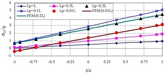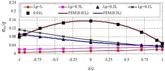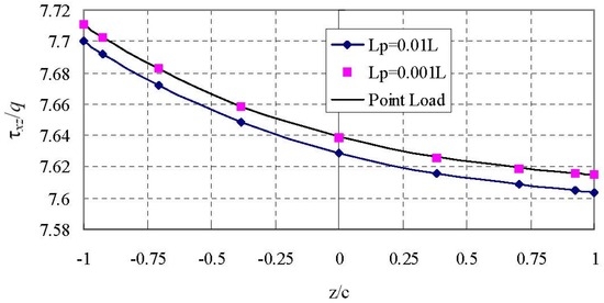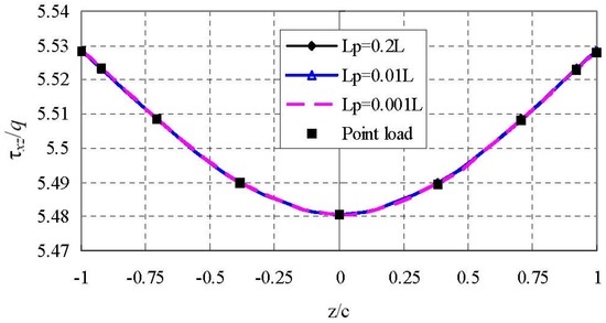 To show the similarity and difference of the through-thickness distributions more clearly for different loadings, much smaller scale than the one in Figure 10 is used in Figure 11 and Figure 12. Figure 11 shows the through-thickness variation of at section x = −0.0464L which is close to the loading area. Two locally distributed loadins (Lp/L = 0.01 and 0.001) and the point load are considered. It is seen that the through-thickness variation of is non-linear and small difference between locally distributed load (Lp/L = 0.01) and (Lp/L = 0.001) is observed. However, the small difference cannot be shown on the larger scale in Figure 10. The through-thickness variations of for the locally distributed load (Lp/L = 0.001) and point load coincide with each other, even in such a small scale. In other words, the two loading cases are identical.