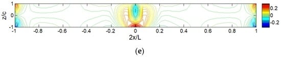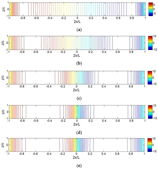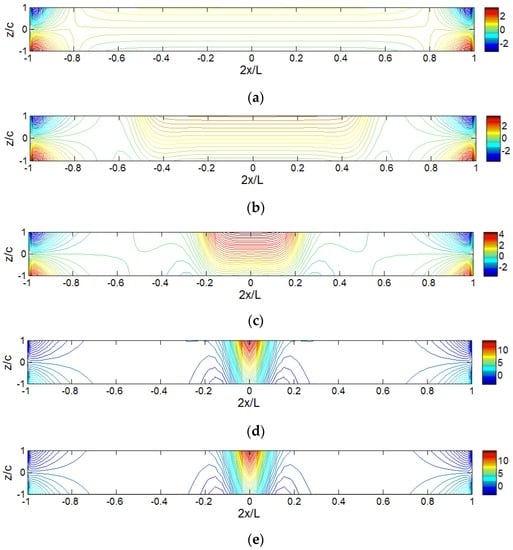 The iso-stress () diagrams for sandwich panels under different distributed loads are shown in Figure 14. Since the diagram for the locally distributed load (Lp/L = 0.1) is already shown in Figure 6 and the diagram for point load is exactly the same as the one for locally distributed load (Lp/L = 0.001), they are not included in Figure 14. The loading effect on the transverse normal stress distributions, especially in the middle area, can be clearly seen. Higher stress appears in the loading area for smaller Lp/L. When the load is applied at a wider range, i.e., Lp/L > 0.5, the highest transverse normal stress is observed at the clamped end. Different from the axial stress distribution, the highest magnitude of transverse normal stress changes significant when the size of loading area is changed. In Figure 13a–e, the highest value of remains in the same level with different Lp/L cases, while the highest value of shown in Figure 14a-e may be increased by several times with smaller Lp/L.