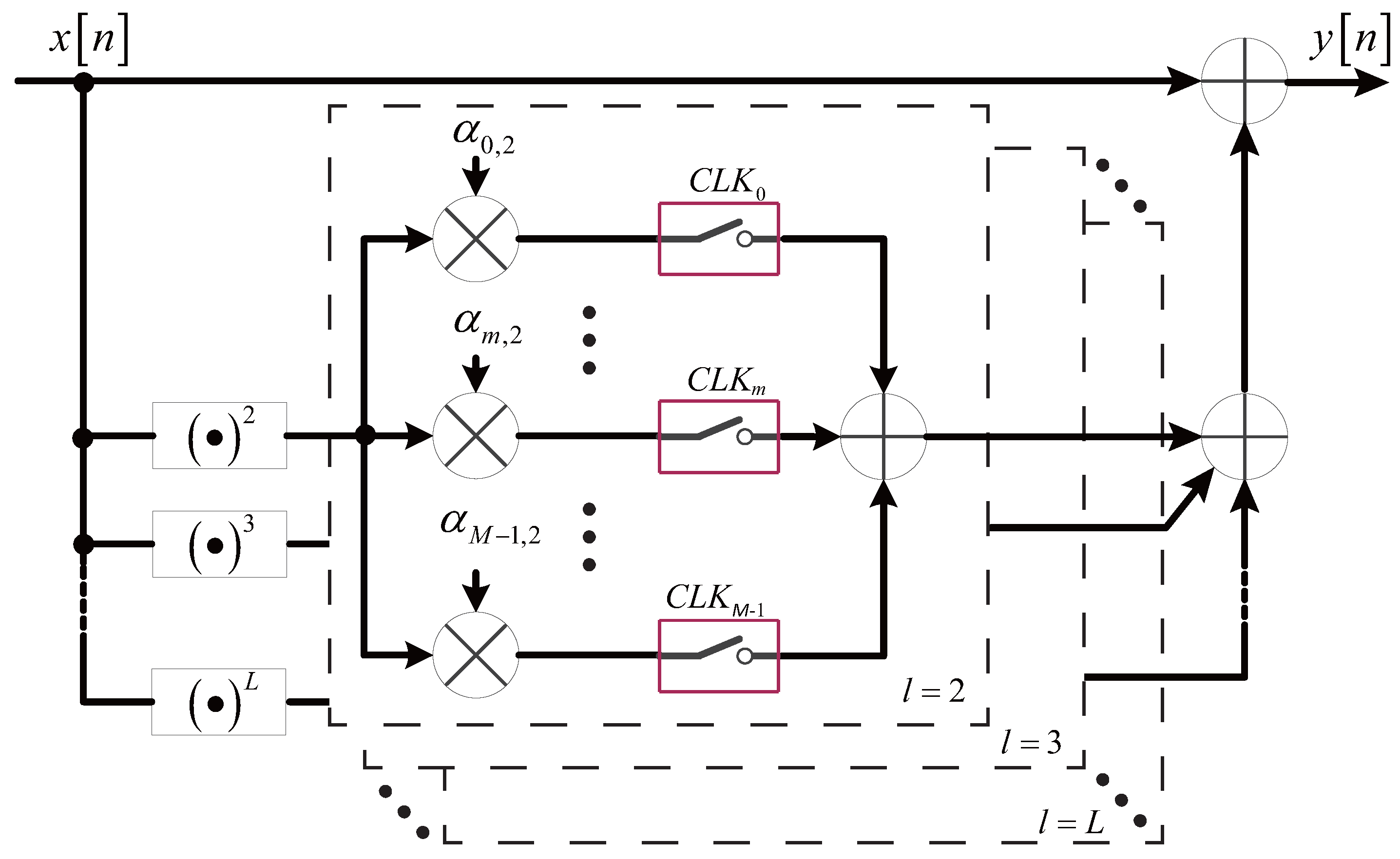 - Johansson, H. A polynomial-based time-varying filter structure for the compensation of frequency-response mismatch errors in time-interleaved ADCs. IEEE J. Sel. Top. Signal Process. 2009, 3, 384–396. [Google Scholar] [CrossRef]