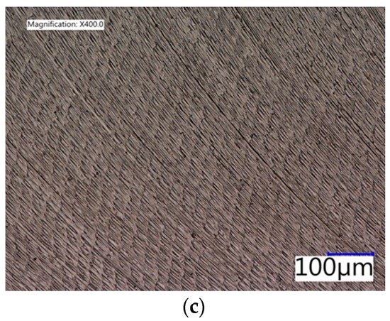 Figure 6 shows optical micrographs (400×) of the surface of a sample machined by unassisted milling, compared to that of samples milled with ultrasonic assistance at frequencies of 20 and 50 kHz. In Figure 6a there are prominent machining marks on the Stavax (modified AISI 420) sample surface. In Figure 6b,c the machining marks are less evident and there are dark lines present associated with ultrasonic assistance. The surfaces were also much finer and more uniform than that processed by unassisted milling.