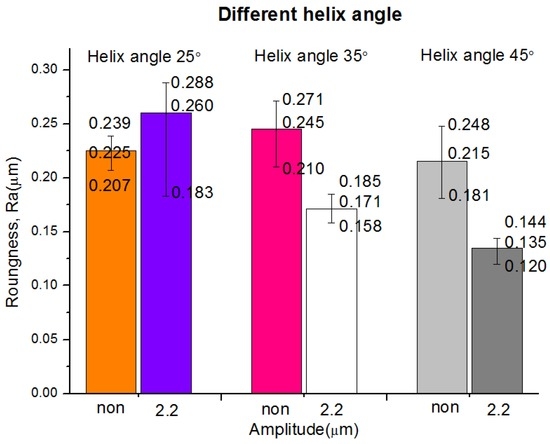Variations in the average surface roughness (Ra) of Stavax (modified AISI 420) milled with and without ultrasonic vibration using cutters with a helix angle of 25°, 35° and 45°.
